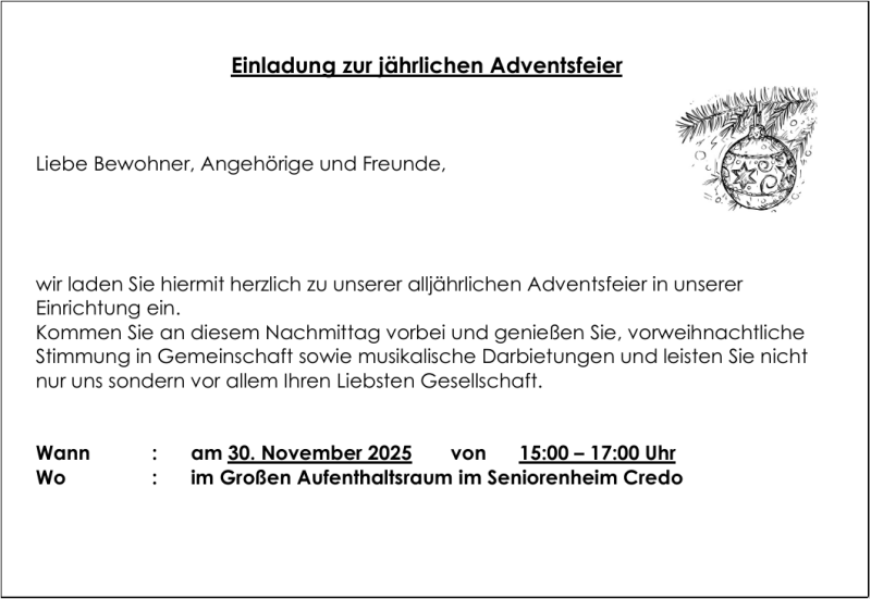 wir freuen uns, Sie herzlich zu unserer diesjährigen Adventsfeier im Seniorenheim Credo einzuladen. Gemeinsam möchten wir in besinnlicher Atmosphäre die Vorweihnachtszeit genießen und ein paar schöne Stunden miteinander verbringen.